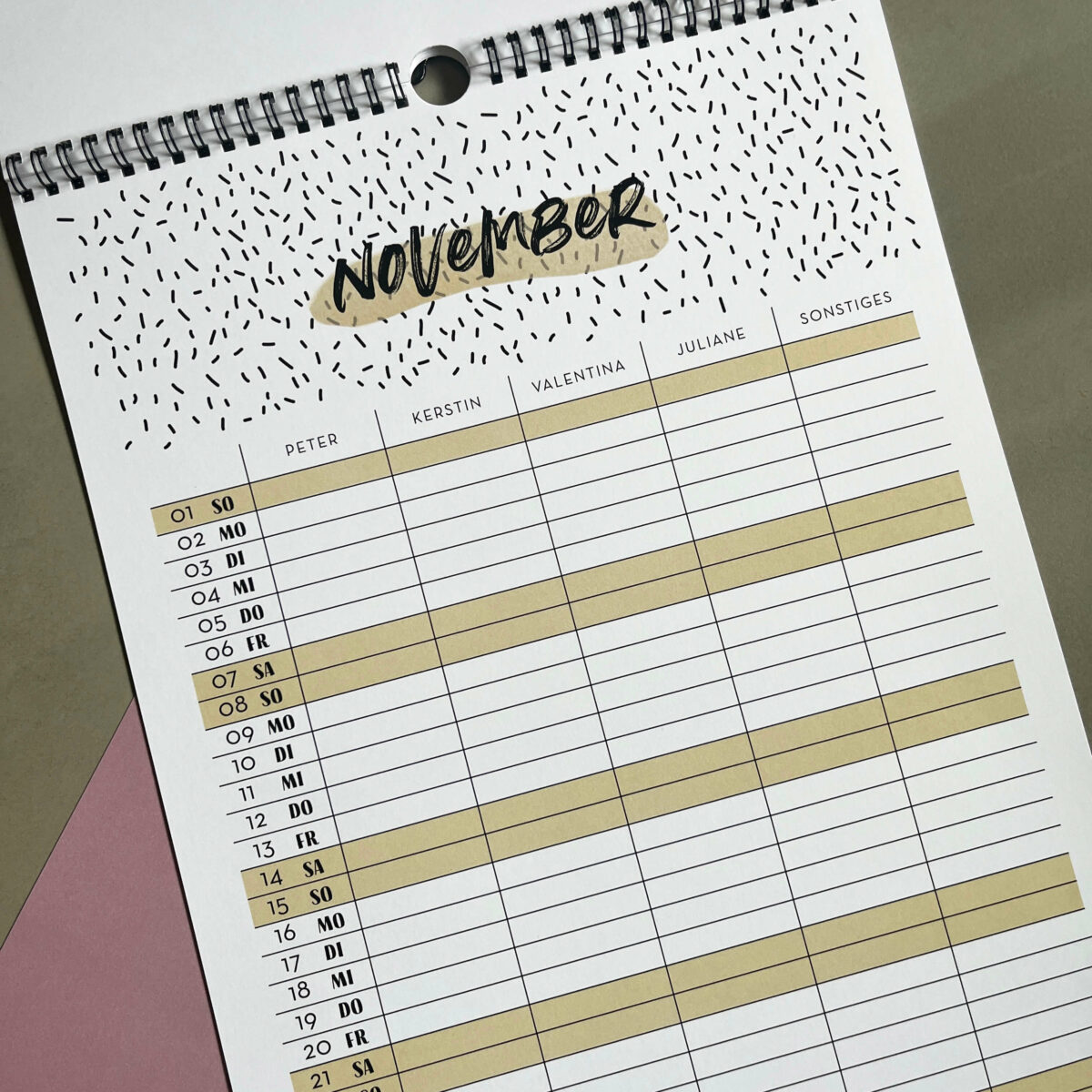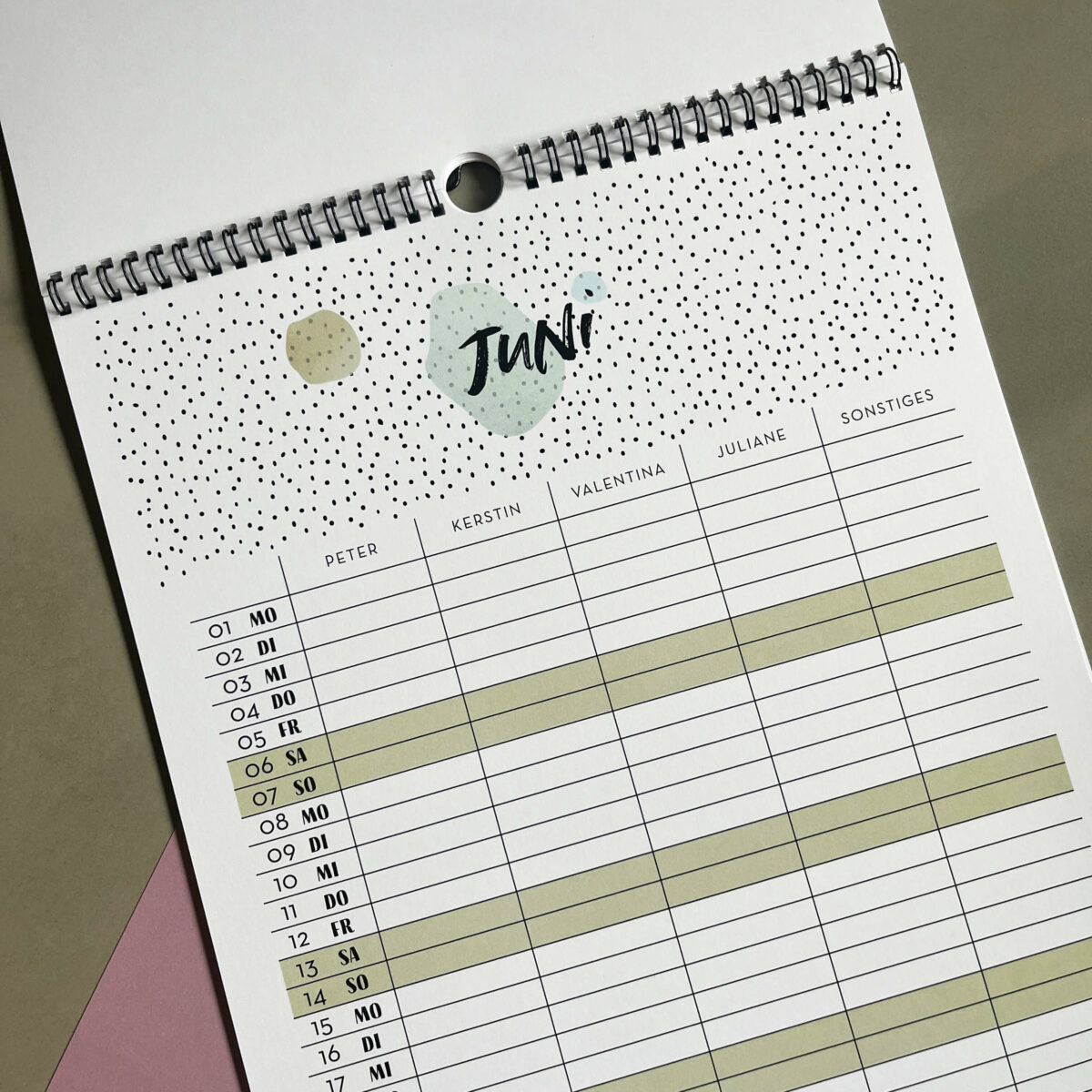 • Übersichtliche Struktur: Wochenenden und Feiertage sind farbig hinterlegt und auf einen Blick