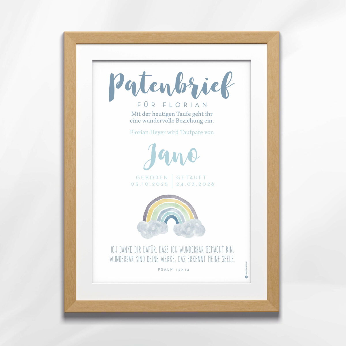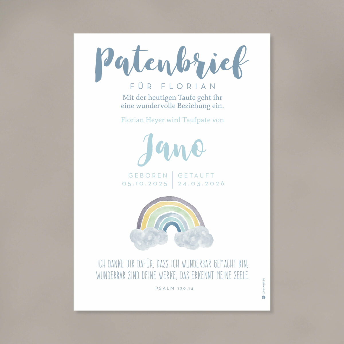 Der Brief wird von mir individuell mit dem Namen des Täuflings, dem Namen der Patin/ des Paten und dem Taufspruch für Dich gestaltet.